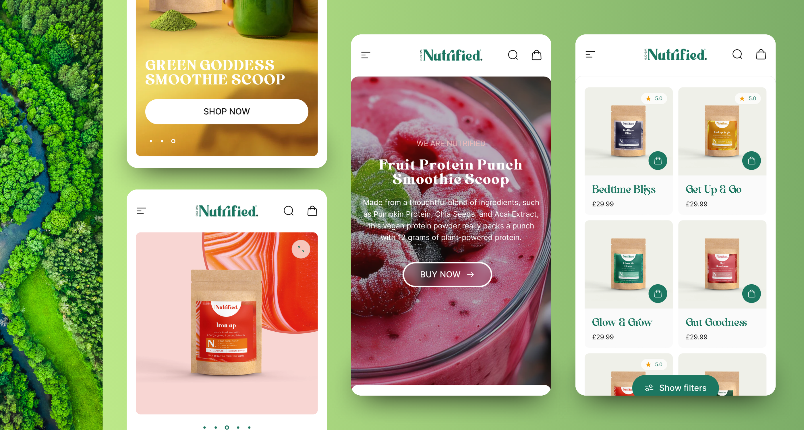 We Are Nutrified's previous website was outdated, slow, and difficult for the team to manage. They needed a fast, responsive site that reflected their sustainable ethos and delivered a seamless user experience. 1HUTCH created a sleek Shopify 2.0 store with engaging movement while maintaining a clean, intuitive design that is both easy for the customer to navigate and simple for the merchant to manage.